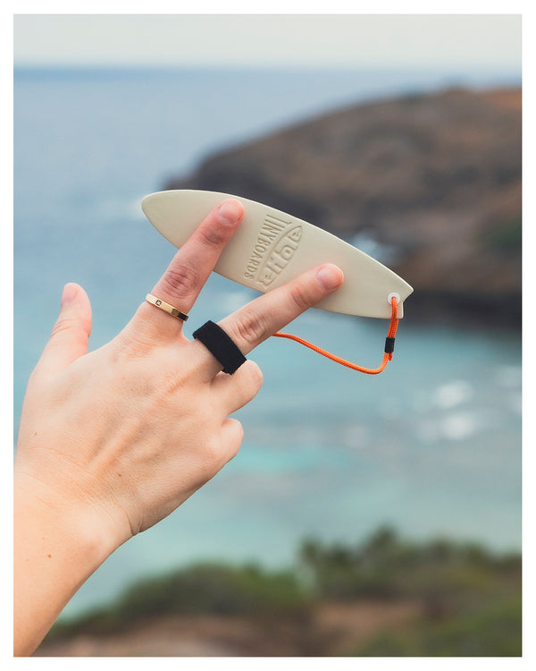 A one-size-fits-all Velcro leash, secured with a stainless steel rivet, so it stays tight on your finger while you surf.
